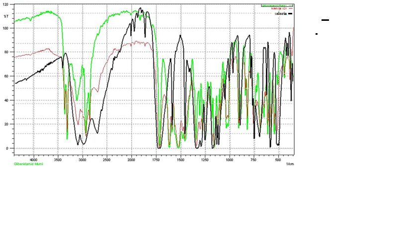Fig. 3: Overlay Infrared spectrum of pure glibenclamide (green line), saccharin (black line), and glibenclamide-saccharin cocrystal (red line)