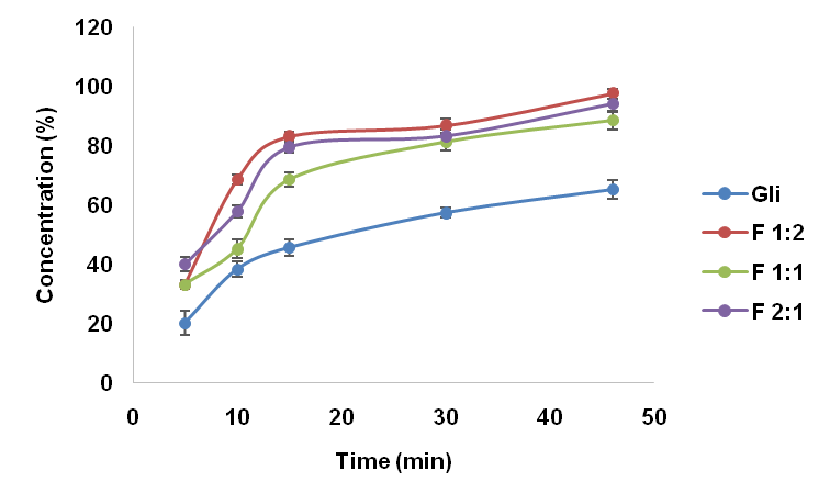 Fig. 6: In vitro drug release study of glibenclamide cocrystal tablet dosage form (All the values were calculated as mean±SD)