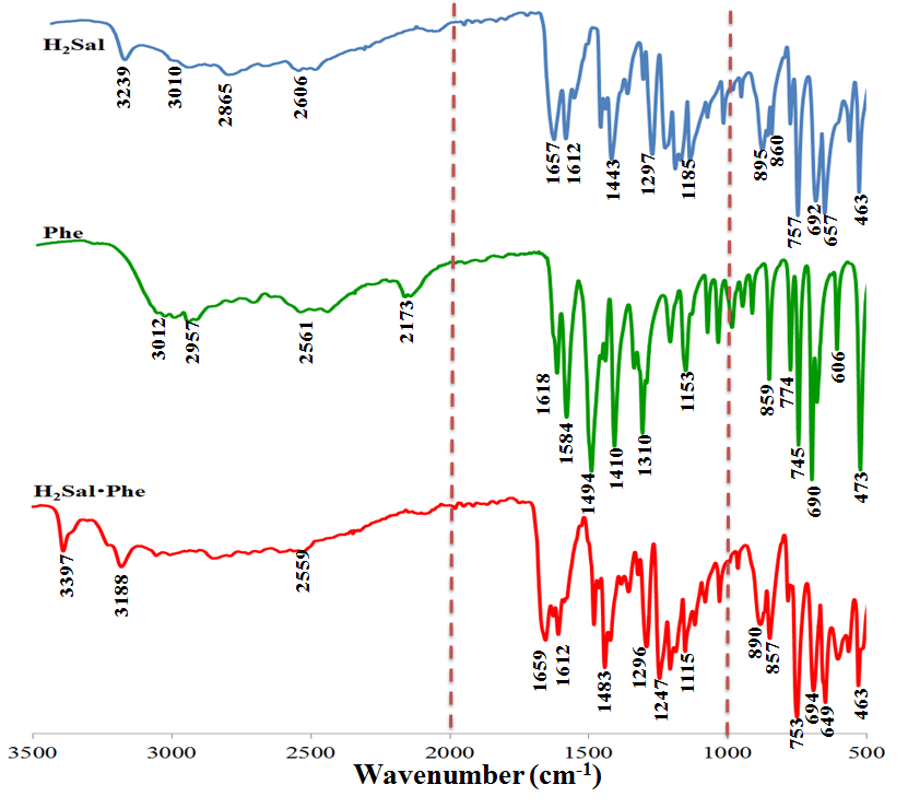CCDC 1545143 contains the supplementary crystallographic data for cocrystal (H2Sal•Phe). These data can be obtained free of charge via http://www. ccdc. cam. ac. uk/conts/retrieving. html, or from the Cambridge Crystallographic Data Centre, 12 Union Road, Cambridge CB2 1EZ, UK; fax: (+44) 1223-336-033; or e-mail: deposit@ccdc.cam.ac.uk.