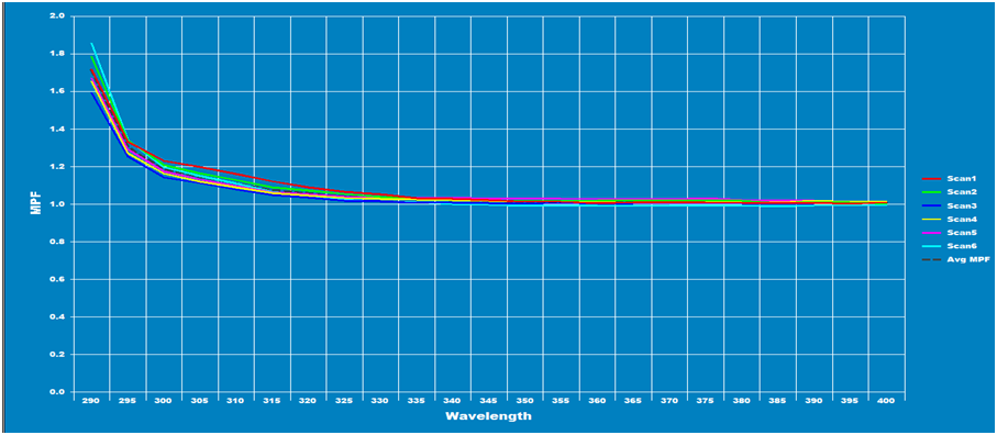 The photoprotective efficacy was assessed in vitro by determining the sun protection factor (SPF) value of the formulations, which was calculated from SPF analyzer (Optometrics LLC/SPF-290F, USA). Divide all each sample from containers into beakers, followed by continuous stirring until the homogeneous appeared. After that, the homogenous sample was divided into a few more beakers with the continuous stirring yield for homogeneous. After completion, labeling the sample and packed in a glass bottle, cover and avoid the light. Each formulation was spread (2 mg/cm2) over a PMMA (polymethyl methacrylate) plates (70.7 mm2) with a fingertip. The plate samples were then allowed to dry for 15 min protected from the light, and exposed to a xenon arc solar simulator. Measurements were made under the following laboratory conditions at 24.0±0,5 °C and 50-60% relative humidity. The measurement was performed by 9 different scanning spots on each sample at 2 nm interval between 290-400 nm. UVB protection efficacy as SPF, UVA protection efficacy as the Boot star rating and critical wavelength was recorded. As a blank reference representing 100% light transmission, an intact, not coated, PMMA plate was used [29]. All of the measurements were undertaken in triplicates.