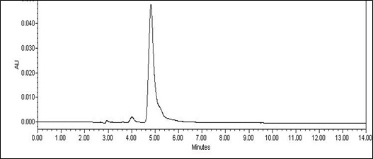 HPLC grade methanol and water in the ratio of 85: 15 was used as mobile phase. Mobile phase was filtered through 0.22µ PTFE filters and degassed by sonicating for 5 min before use. The flow rate and injection volume were kept at 1.0 ml/min and 20 μL, respectively. The column effluent was monitored at 268 nm by PDA detector. Initially, a mobile phase mixture of methanol and water was used to develop the HPLC method of Chrysin in SLN. However, the method has not proved repeatability or accuracy. Consequently, different ratios of methanol and water as mobile phase were used. The best peak with respect to width and symmetry was observed with a mobile phase of methanol and water in the ratio of 85:15 (v/v) and a flow rate of 1.0 ml/min. The peak was detected at 4.6 min (fig. 1) and chromatographic conditions were summarized in table 1.