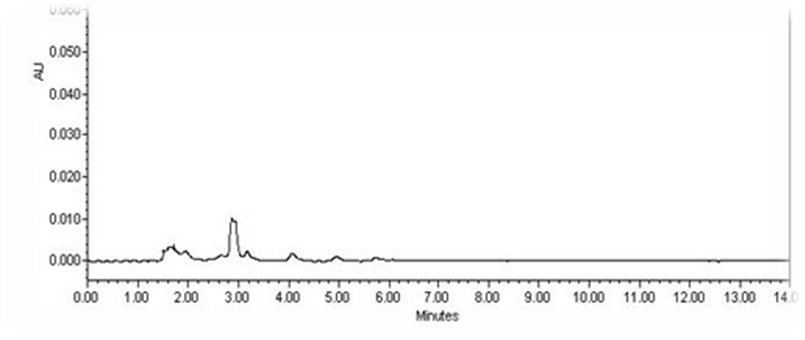 The specificity of the method was ascertained by analysing the standard drug and sample. The peak for Chrysin in SLN samples was confirmed by comparing the Retention time (RT) values with that of the standard. The peak purity of Chrysin was assessed by comparing the spectra at three different levels, that is, peak start, peak apex, and peak end positions of the spectrum. The specificity is considered the first analytical validation step, it must be ensured that the components of the formulation such as excipients, does not interfere in the quantification of the drug. The specificity of the method was evaluated by comparing the chromatograms of Chrysin extracted from solid lipid nanoparticles with that of standard solution of Chrysin. The representative chromatogram of the Chrysin sample (fig. 2) showed the peak at approximately 4.6 min, which was in agreement with that obtained for the standard (fig. 1). No peaks at this retention time were observed in the chromatogram of the blank SLNs (fig. 3), which indicated no interference in the quantitative determination of Chrysin from the formulation.
