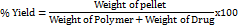 The extruder used is of the axial-type single-screw feeder and hence generates heat due to the friction of the screw feeder with the wall of the extruder. Thus, varying the speed of the extruder to either medium or low resulted in drying of the wet blend within the extruder. Hence, the speed of extruder was fixed at maximum for a better output of extrusion. In this study, during preliminary trials, it was observed that initial high-speed spheronization is required to reduce the length of extrudes, but if the same speed is continued further, a greater amount of fines were generated. Hence, to reduce the generation of fines and achieve spherical pellets, spheronization speed and time could not be fixed at one value. Initial high speed followed by medium speed, enough to round off extrudes, was applied to manufacture pellets. The inability of extrudes to break at low spheronization speed can be the result of high drug content in wet mass. Moreover, the time required to spheronize the same was also higher than usual processing owing to less percent w/w of MCC in the formulation. It took more time to spheronize the cut extrudes with varying speed during the process. Moreover, high drug loading resulted in granules which were difficult to extrude when extrusion screen below 1 mm was used. Higher screen size resulted in high pellet diameter, and thus the extruder screen was fixed to 1 mm.