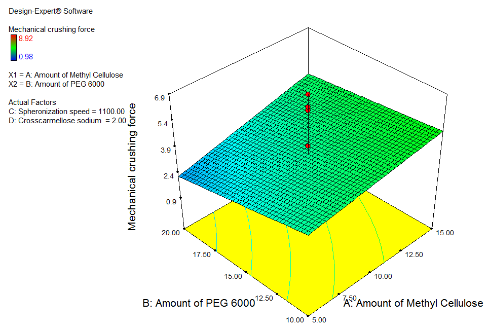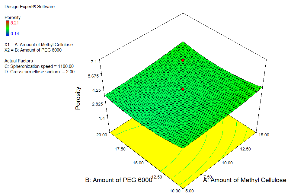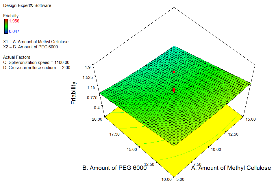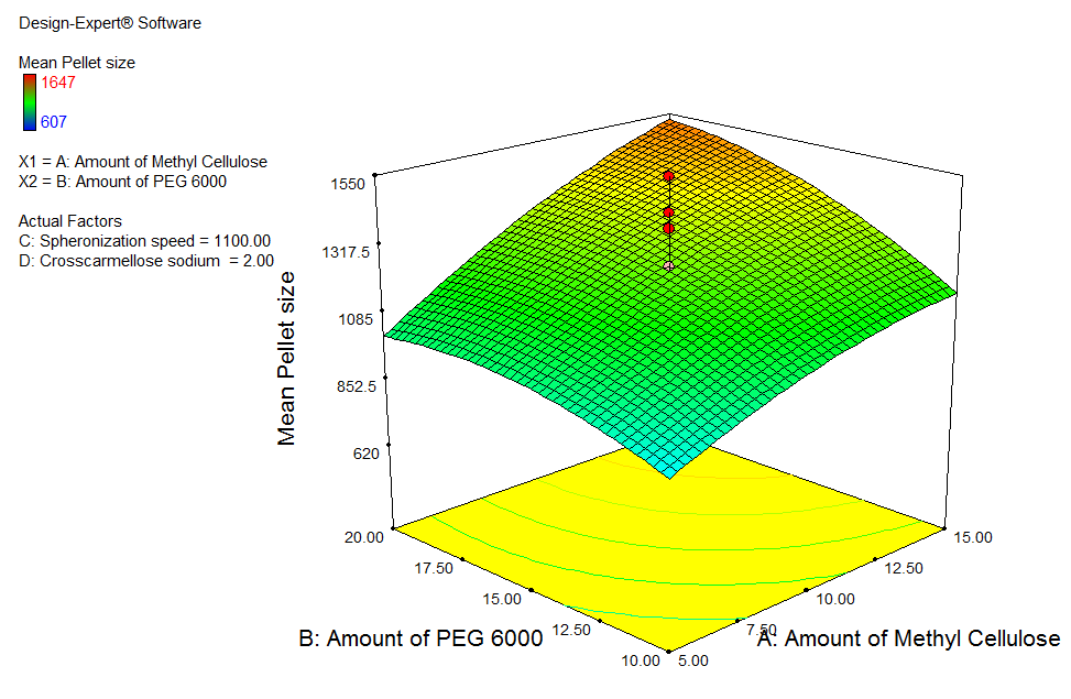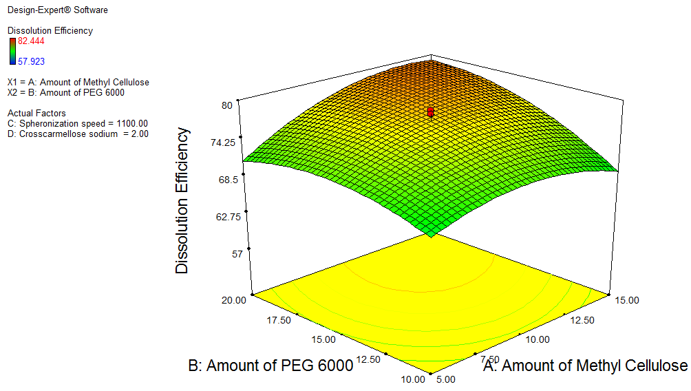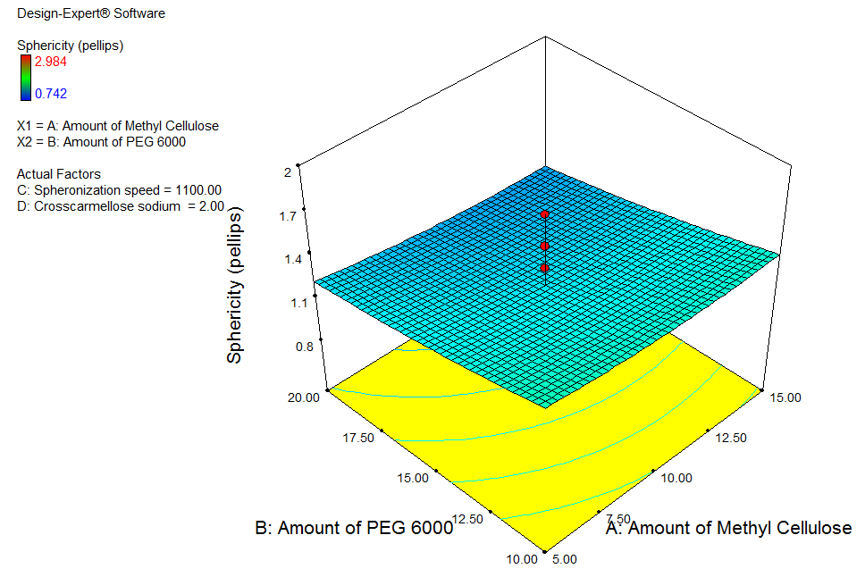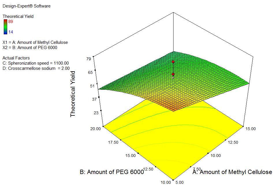 The design expert version 7.0 software (Minnesota, USA) was used in the current study for the generation and evaluation of the statistical experimental design. The independent variables concentration of methylcellulose (%), PEG 6000, Croscarmellose Sodium (%) and Spheronization Speed (rpm) of pellet obtained by using melt extrusion and spheronization technique against dependent variables i.e. Theoretical Yield (%), Mean Pellet Size (mm), Sphericity (pellips), Friability (%), Porosity (%), Mechanical Crushing Force(N) and dissolution efficiency (DE) was studied (table 2).