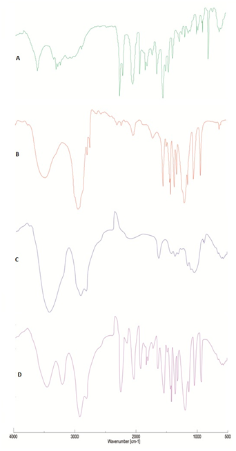 Fig. 9: FTIR spectra of A) Tamoxifen Citrate B) PEG 6000 C) Methyl Cellulose and D) Pellets