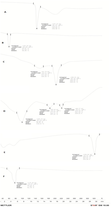 Fig. 10: DSC thermograph of A) Tamoxifen citrate B) PEG 6000 C) citric acid, D) methylcellulose E) microcrystalline cellulose and F) extruded pellets