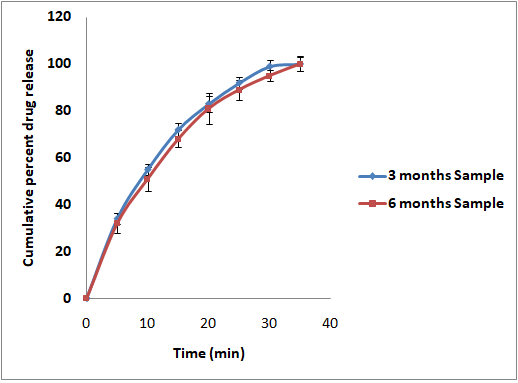 Fig. 13: Dissolution profile of initial, 3 Mo and 6 Mo stability sample of tamoxifen citrate immediate release pellets