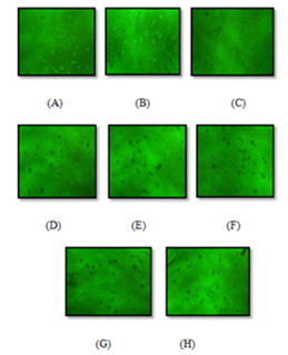 Fig. 16: Inverted Microscopic Images of MCF-7 Cells treated with after addition of MTT (A) Control-1, (B) Control-2, (C) 1µg/ml, (D) 10 µg/ml, (E) 20 µg/ml, (F) 40 µg/ml, (G) 80 µg/ml, (H) 100 µg/ml