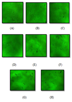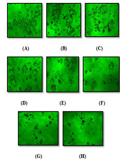 Fig. 15: Inverted Microscopic Images of MCF-7 Cells treated with optimised immediate release pellets after 24 h. (A) Control-1, (B) Control-2, (C) 1µg/ml, (D) 10 µg/ml, (E) 20 µg/ml, (F) 40 µg/ml, (G) 80 µg/ml, (H) 100 µg/ml