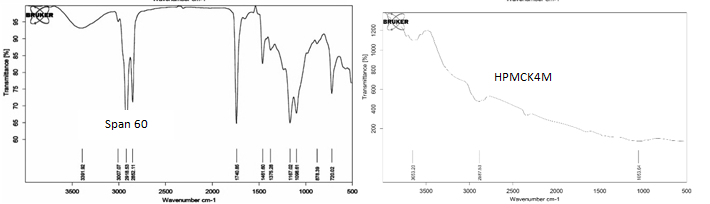 FTIR spectra indicate that the principal peaks present in the raw materials (Soybean oil, Span 60, HPMCK4M and paracetamol) were preserved in the drug-loaded bigels [16].