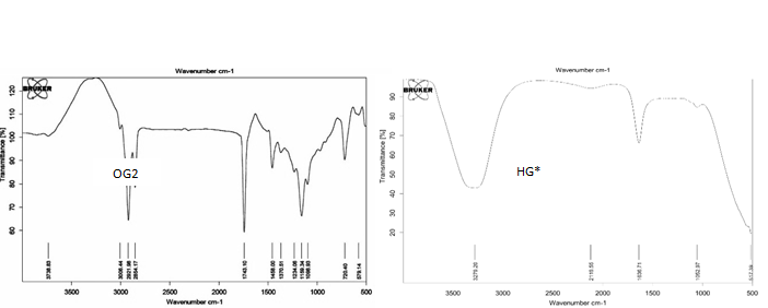 Fig. 1: FTIR analysis of gel components, blank gels (OG* and HG*) and drug-loaded gel (OG2 and BG4)