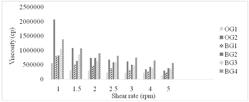 The viscosities of both organogels and bigels showed concentration-dependent behavior, i.e. increase in viscosity with increase in oraganogelator or aqueous gelling agent (HPMC) concentration. The bigels (BG1 and BG2) formulated with organogel containing 20% w/v Span (OG1) were found to possess higher viscosity than OG1. However, an anomalous behavior was observed with bigels (BG3 and BG4) of organogel developed with 22%w/v Span (OG 2) where viscosity is lower than the corresponding organogel. In case of BG3 and BG4 with higher % of organogelator which is primarily a surfactant, probably an emulgel of lower viscosity would have been formed on addition of 3 and 4% w/v HPMC gels. Lower % of Span in OG1 did not promote emulgel formulation in the bigels (BG1 and BG 2) and hence, their viscosities are higher than the corresponding organogel. Both organogel and bigel formulations demonstrated non-Newtonian pseudoplastic flow and shear thinning behavior similar to that observed with sunflower oil and protein based novel bigels as matrices for drug delivery applications as reported by Behera et al. [21].