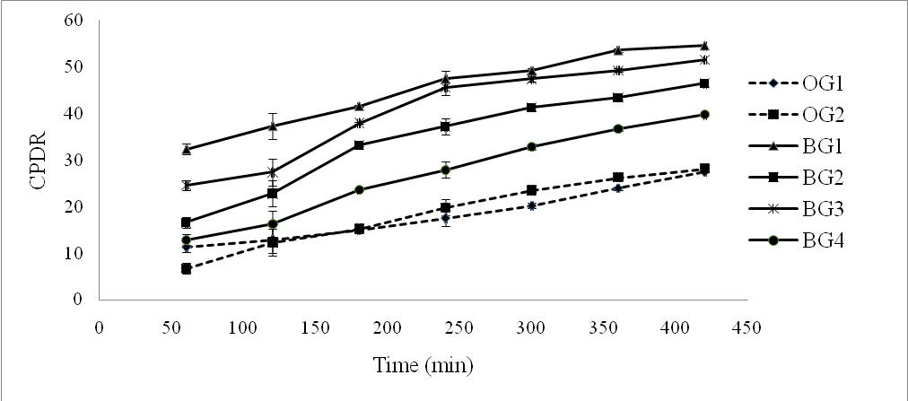 Only ~27% drug release was observed from organogels, OG1 and OG 2 containing 20 and 22% w/v Span 60 respectively while it varied between 40 to 54% in HPMCK4M based bigels (fig. 3). However, it was noted that an increase in the concentration of HPMC in hydrogel lowered release of PCM from the bigels which was still better than that from organogels.