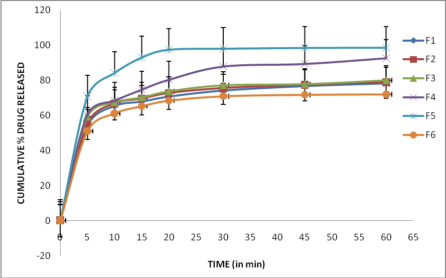 Fig. 1: Drug release profiles of telmisartan FDTs prepared by wet granulation method (F1–F6); mean±SEM, n=3