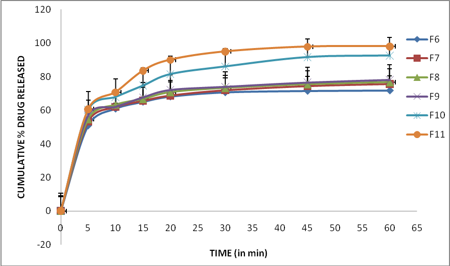 Fig. 2: Drug release profiles of telmisartan FDTs prepared by wet granulation method (F6–F11); mean±SEM, n=3