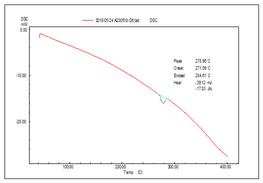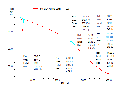 The DSC thermographic studies were carried out on pure drug of Telmisartan, JFS2, CCS, Fast dissolving tablets of Telmisartan F5 and F11. These studies exhibited an endothermic peak at 278.96 ° for Telmisartan pure drug, broad endothermic peaks for jack fruit seed starch at 68.39 °C and 312.00 °C and a sharp exothermic peak at 319.1 °C for CCS. A broad endothermic peak at 268.43 °C and a sharp endothermic peak at 59.48 °C were observed for F5 formulation, an FDT made with Telmisartan and JFS2, indicating that there is a slight shift in temperature for drug and JFS2. A sharp endothermic peak at 274.22 °C and a broad exothermic peak at 314.7 °C were observed for formulation F11, an FDT made with Telmisartan and CCS was observed indicating that there is a slight shift in temperature for drug and CCS. The detailed thermographs were shown in fig. 4.