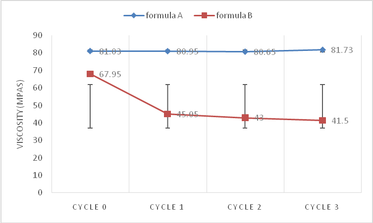 Fig. 1: The viscosity profile of formula A and formula B syrup mean±SD (Standard deviation), n = 4