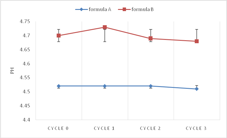 Results of formula syrup stability test after receiving extreme temperature treatment of FTC method 3 cycles. The data obtained after the formula A and formula B syrups receiving extreme temperature treatment of FTC method for 3 cycles, were showed in table 2, fig. 1, 2 and 3. Formula B syrup changed significantly since cycle 1, these were characterized by the microbial number (table 2), the profile of viscosity (fig. 1), the profile of pH (fig. 2), and the profile of pouring power (fig. 3) as the parameters of formula A and formula B syrup after receiving FTC method for 3 cycles. Each point of fig. 1, 2 and 3 represented as mean±SD (n=4).