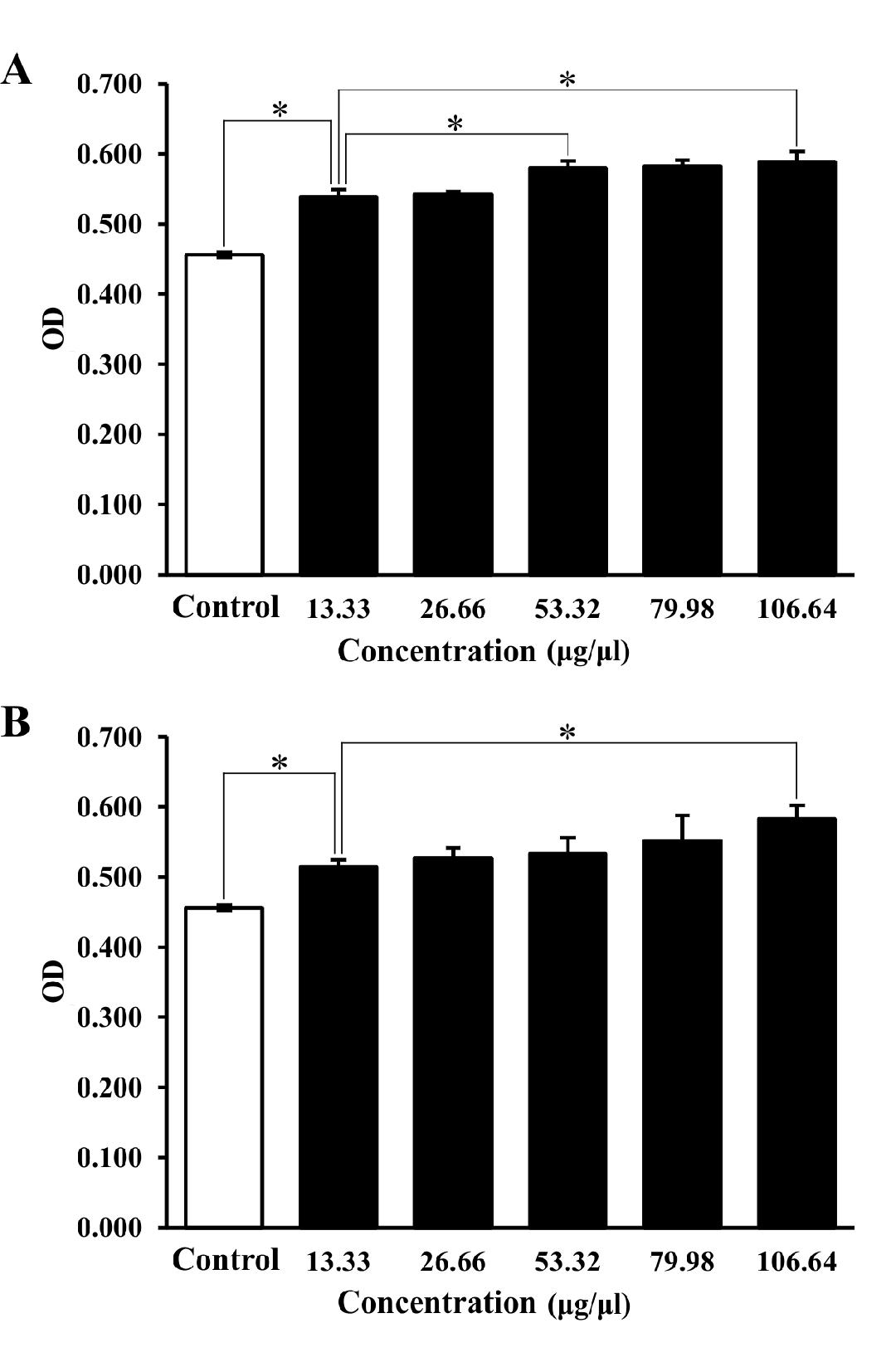 The result of lymphocyte cells proliferation obtained from cells was cultured with test samples [SPFN solution and the selected formula (formula A) of SPFN syrup, briefly as SPFN syrup] for 48 h. Cell viability determined using MTT assay. The SPFN solution and SPFN syrup could significantly increase lymphocyte cells proliferation (fig. 4). The SPFN solution (fig. A) showed a significant increase at concentration 53.32 μg/μl. The highest level of lymphocyte cell proliferation showed at a concentration of 106.64 μg/μl. The results showed an increase of lymphocyte cells proliferation affected by the concentration of the SPFN solution. Based on the results of statistical analysis, there was no significant (p<0.05) difference between the OD of SPFN solution and SPFN syrup (fig. 4 B) in the majority of the polysaccharide fraction concentration. Therefore, the SPFN syrup did not affect the immunostimulant activity The SPFN solution and SPFN syrup, for stability test, both also received extreme temperature treatment of FTC method for 3 cycles. The OD values obtained after receiving FTC method showed significant differences of SPFN solution at concentration 13.33 μg/μl; 53.32 μg/μl and 79.98 μg/μl respectively (fig. 5A), while the OD values obtained after receiving FTC method of SPFN syrup (fig. 5B) did not show a significant differences in all concentrations.