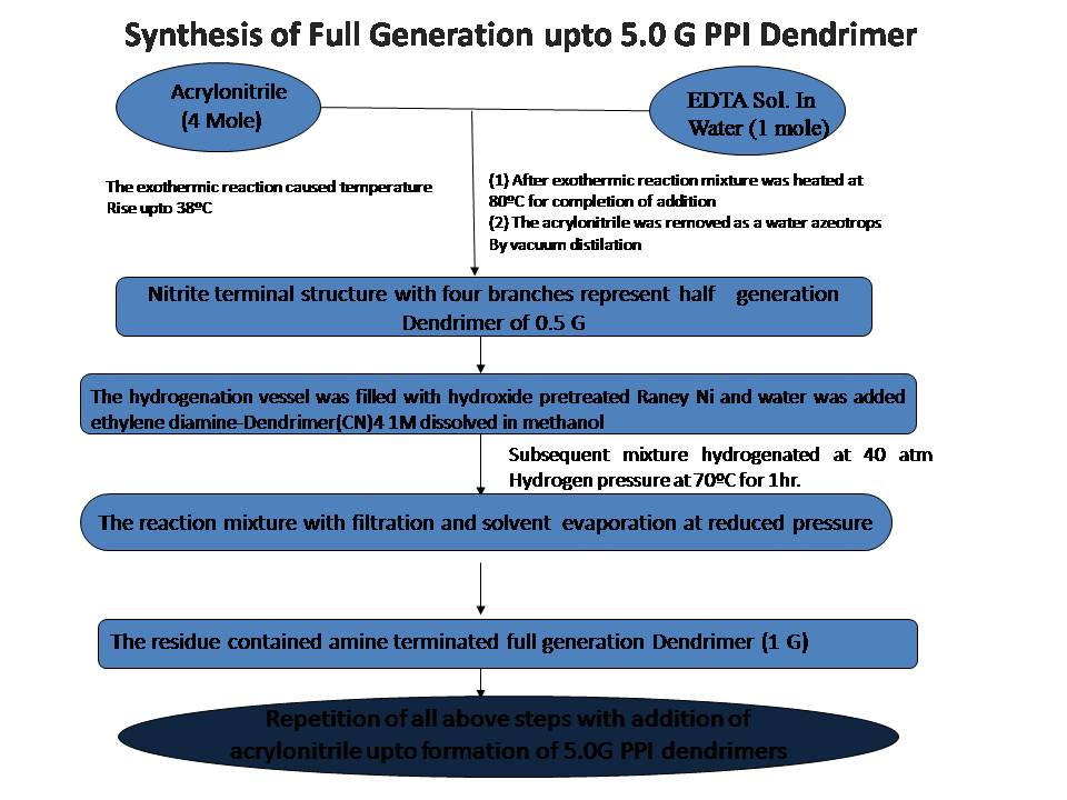 The different generations (3.0G, 4.0G and 5.0G)of PPI dendrimer were synthesized from the reported divergent method in which EDTA was used as inner core while acrylonitrile as branching moiety.[22-24] [8] The detailed synthesis is shown in fig. 2.