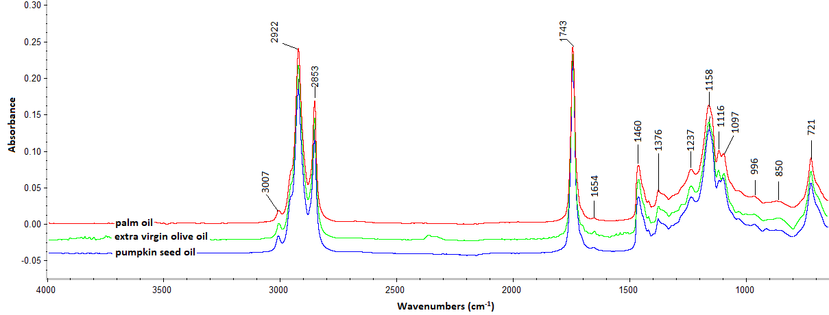 Fig. 1: FTIR spectra using attenuated total reflectance mode of palm oil, extra virgin olive oil, and pumpkin seed oil acquired at mid-infrared region (4000-650 cm-1)