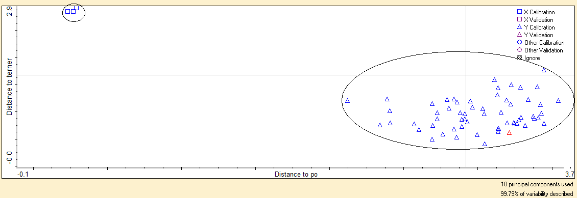 Fig. 3: The discriminant analysis expressed by Cooman’s plot for the discrimination of palm oil and palm oils in ternary mixtures with extra virgin olive oil and pumpkin seed oil
