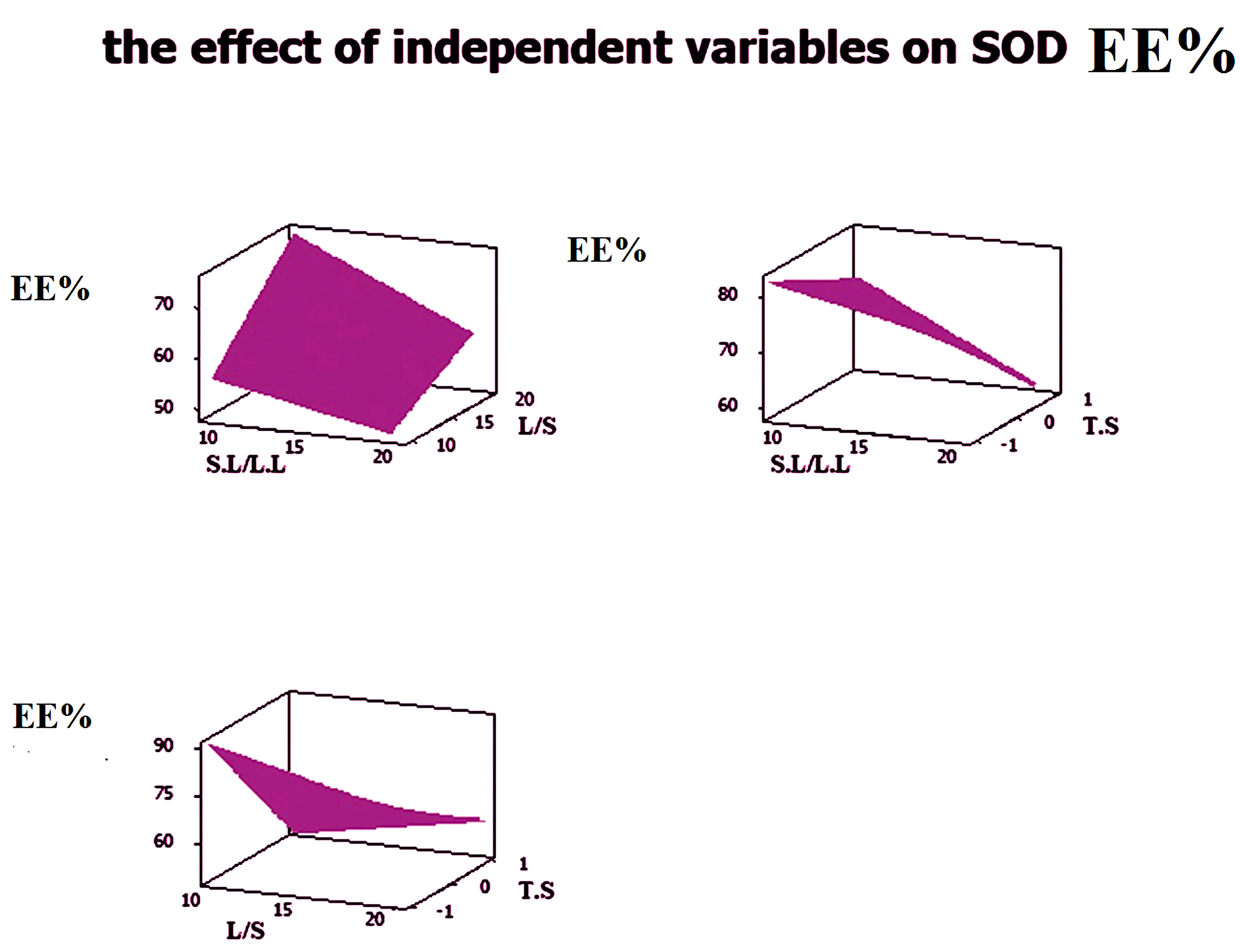 Fig. 1: Surface plots of correlations between independent variables and SOD entrapment efficiency (EE%)