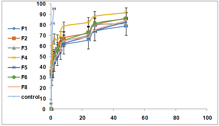 Fig. 2: Release profiles of SOD from niosome formulations F1-8 in phosphate buffer at pH 7.4. Data are expressed as the mean±SD (n = 5)