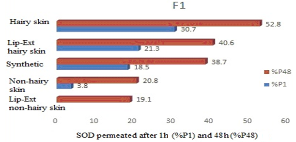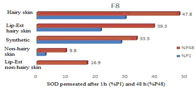 -The values of %P1 and %P48 for both niosomal formulations were significantly higher than those for SOD solution in hairy skin models. But in non-hairy skin, the value of %P48 after application of SOD solution was lower than F1 and higher than F8. It means that in non-hairy skin, early hours after application both formulations increased SOD partitioning into the skin more than SOD solution that is in accordance with its hydrophilic property. But after several hours, SOD permeation through non-hairy skin (%P48) was affected by particle size; therefore, F8 with high particle size demonstrated lower values of %P48 than SOD solution.
