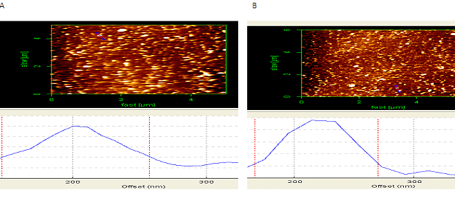 Fig. 4: AFM images of niosomal formulation immediately after preparation (A) and after 6 mo of storage at 2-8°C (B)