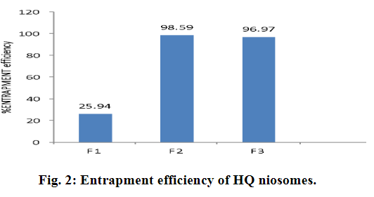 The HQ-entrapped niosomes were separated from the unentrapped free drug by freeze-thawing/centrifugation method [18]. One ml samples of the prepared niosomal dispersions were frozen for 24 h at-20 °C in ependorf tubes. The frozen samples were removed from the freezer and centrifuged at 15,000 rpm for 10 min. Niosomal pellets were suspended in PBS (pH 7.4) and then centrifuged again. This washing step was repeated two times to ensure that an un-entrapped drug was no longer present in the void volume between the niosomes [18]. Supernatant was separated as it contains an unentrapped drug, which is highly soluble in PBS 7.4, using a micro-pipette. To the remaining pellet in the centrifuge tube, 500 µl of 0.1 N NaOH (as the drug is highly soluble in 0.1N NaOH) was added and vortexed thoroughly for 3 min. After vortexing, a white suspension was obtained and 1 ml of this suspension was taken with a micro-pipette and transferred to a test tube. To this 5 ml methanol was added, which resulted in a clear solution; this was further vortexed in a vortex mixer for 2 min, such that to ensure that the niosomes are lysed completely to release the drug. This solution (1 ml) was further diluted with methanol and filtered using membrane filter and the absorbance was determined using a UV spectrophotometer at 295 nm [19]. The entrapment efficiency (EE) is expressed as