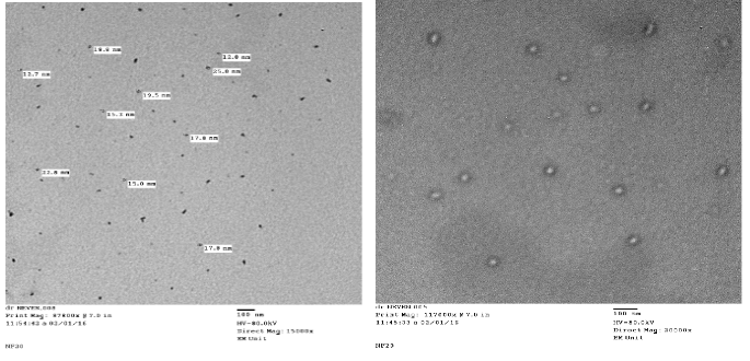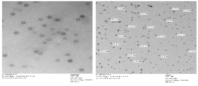 The prepared niosomal formulations with the highest entrapment efficiency were characterized for their morphology using TEM. To an aliquot of a suspension of prepared niosomal formulation, a sufficient quantity of 1% phosphor tungstic acid was added and mixed gently. A drop of the mixture was placed onto the carbon-coated grid and drained off the excess. The grid was allowed to dry, and it was observed under TEM. Electron micrographs were taken at suitable magnification [17].