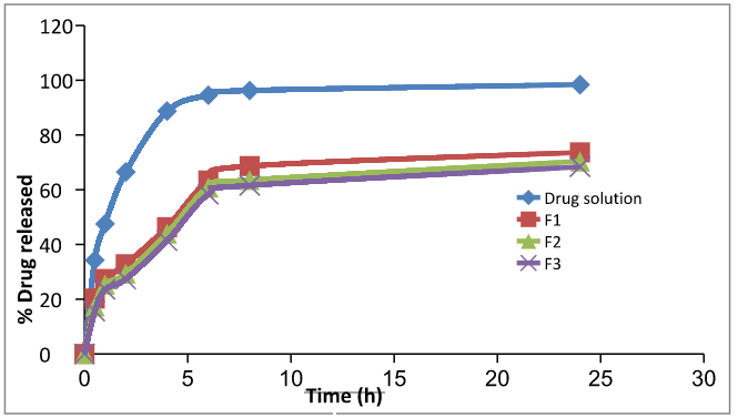 Half g of each formulation containing 10 mg of HQ was transferred to a dissolution cell to which a cellulose membrane of the molecular weight cut off 10,000 was attached to one side and the other side of the tube was attached to the stem of the dissolution apparatus and immersed in a beaker of the dissolution apparatus containing 100 ml of PBS (pH 7.4). The temperature of the medium was maintained at 37±0.5 °C. At specified time intervals for 24 h, 4 ml samples were withdrawn, and the drug was determined spectrophotometrically at λmax295 nm. Each sample withdrawn was replaced by an equal volume of PBS (pH 7.4).