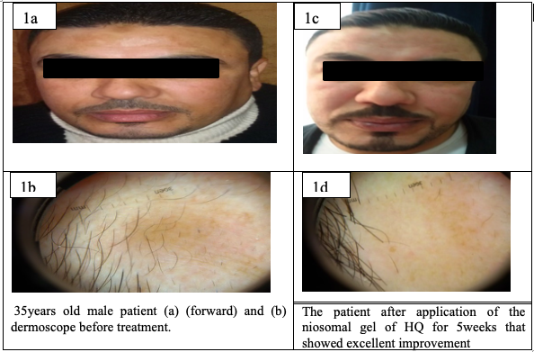 The current work succeeded in proving that incorporating HQ in niosomal gel improves its therapeutic effect regarding clinical efficacy, shorter duration of treatment, nearly absence of side effects and lesser recurrence. Niosomal gel of HQ also demonstrated that it has better patient compliance than Clearique 2%® delta pharma since the second one causes erythema, pruritus and burning sensation at the site of application.