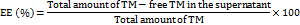 Nanoparticle sample was centrifuged with a speed of 15000 rpm for 30 min at 4 °C to separate the unentrapped drug with the nanoparticle precipitate. The supernatant was then diluted with HCl 0,1 M and analyzed for TM content using UV-Vis spectrophotometer at 296 nm. HCl 0,1 M was used as the blank. The test was conducted in three replicates for each sample. The entrapment efficiency (EE) value was calculated using following equation:
