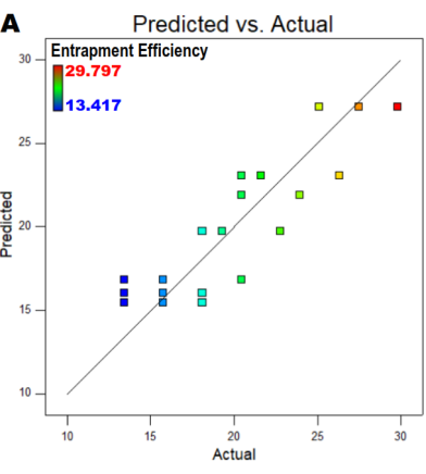 Fig. 1: Actual and predicted value correlation of entrapment efficiency (A), particle size (B), and polydispersity index (C)
