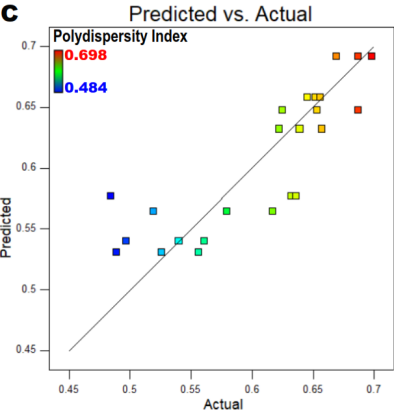 The result of verification study of particle size was also indicated that the values observed in the verification were not significantly different with the predicted values and in the range of 95% CI and 95% PI, while the polydispersity index verification study showed that the observed value was in the range of 95% PI. Based on the one-sample t-test results of the observed value of particle size and polydispersity index, the p-values of particle size and polydispersity index were respectively 0.486 and 0.269, which indicated that the observed values were not significantly different from the predicted values.
