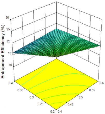 | Entrapment Efficiency (Y1) | Y1 = 64.199–43.854X1–141.348X2–447.975X3+175.470X1X2–1170.583X1X3+1949.416X2X3 |