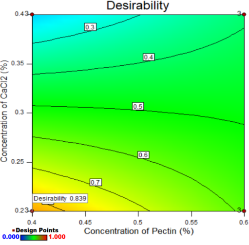 The entrapment efficiency is also affected by the interaction between the concentration of PC and CC. It can be seen in the table 1 that in the most of experiments with the low concentration of CC (0.2% (w/v)), the entrapment efficiency values were lower when the high concentration of PC (0.6% (w/v)) is used than the low concentration of PC (0.4% (w/v)). The decrease of entrapment efficiency can be occurred due to the increase of the solution viscosity generated by a high concentration of PC. The higher solution viscosity subsequently causes an inadequate interaction between the PC and the cross-linking agent [19].