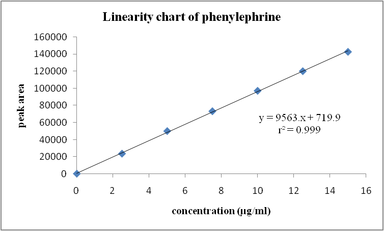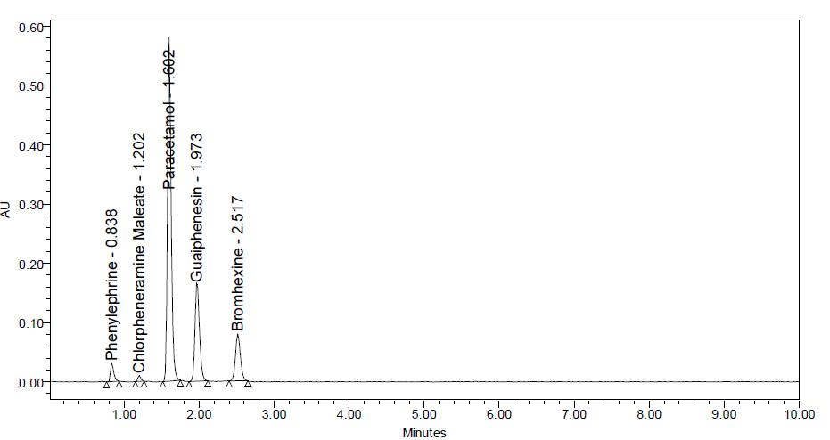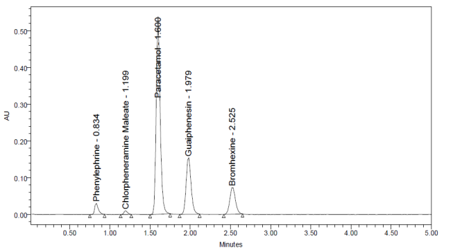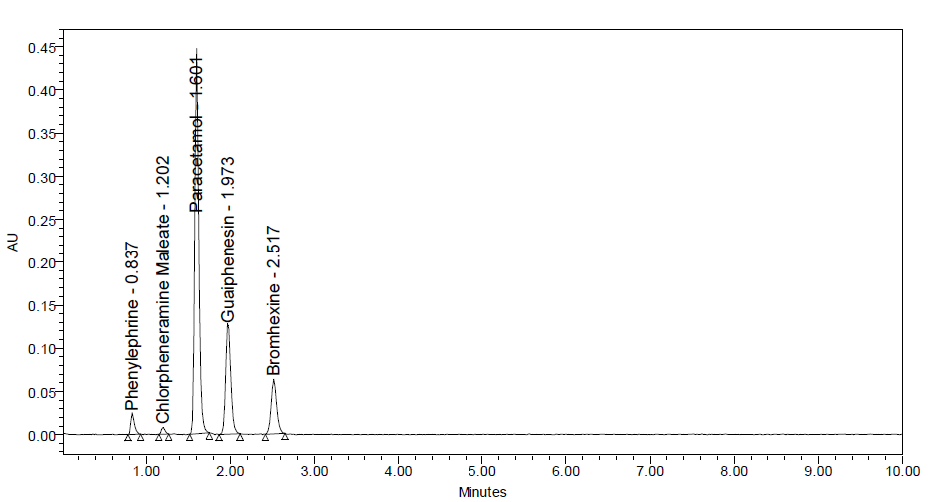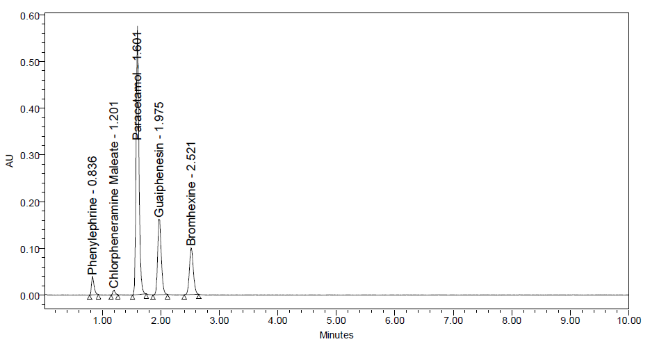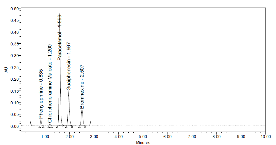 The standard stock solution was prepared by weighing 2.5 mg of phenylephrine hydrochloride, 0.5 mg of chlorpheniramine maleate, 81.25 mg paracetamol, 25 mg of guaiphenesin and 2 mg of bromhexine hydrochloride and transferred to 25 ml volumetric flask. To this 10 ml of diluent was added, sonicated for 25 min and the volume was made up with diluent. From the above standard stock solution 1 ml was transferred into 10 ml volumetric flask and made up to the volume with diluent so as to get final concentration of 10 μg/ml of phenylephrine hydrochloride, 2 μg/ml of chlorpheniramine maleate, 325 μg/ml of paracetamol, 100 μg/ml of guaiphenesin and 8 μg/ml of bromhexine hydrochloride.