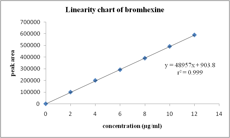 The applicability of the developed method was verified by assaying the marketed formulation. Kuff Q NF tablets were analyzed by standard comparison method. The prepared standard and sample solutions were injected into the chromatographic system and the amount of drug present in the formulation was calculated and the results were tabulated in table 8. The results complied with the label claim and specify that the developed method was successfully applied for quality control of formulation.