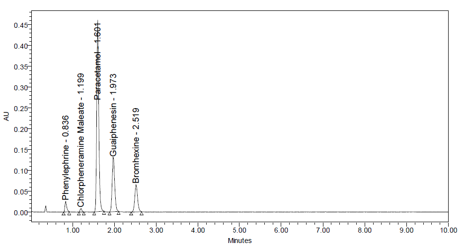 The combination of phenylephrine hydrochloride, chlorpheniramine maleate, paracetamol, guaiphenesin and bromhexine hydrochloride is available as tablets in the market till date which is used to treat cough, fever, cephalalgia, cold, catarrh, flu, hay fever and allergies due to food. Extensive literature survey revealed various analytical techniques for the estimation of mentioned drugs individually [1] and with other combinations [2-14]. An RP-HPLC method has been reported for the simultaneous estimation of phenylephrine hydrochloride, chlorpheniramine maleate, paracetamol, guaiphenesin and bromhexine hydrochloride in bulk and tablet dosage form [15]. In this method the retention time of analytes was high with a run time of 35 min thereby increasing the solvent consumption and leading to longer analysis time. The mode of separation was gradient and has used two mobile phases one of which was a combination of potassium dihydrogen phosphate buffer with octane-1-sulphonic acid reagent. Usage of buffers reduces the life of the column and preparation of mobile phases consumes more time, thereby increasing the analysis time. Hence, a rapid method is needed for the estimation of these drugs which can be attained by using UPLC technique with high sensitivity and less time of analysis. In addition to this, no UPLC method has been reported for the assay of specified drugs either individually or simultaneously in bulk and pharmaceutical formulation. Therefore, it was thought appropriate to develop stability-indicating ultra-performance liquid chromatographic procedure that serves as a rapid, simple, accurate, and sensitive method for the simultaneous estimation of phenylephrine hydrochloride, chlorpheniramine maleate, paracetamol, guaiphenesin and bromhexine hydrochloride in bulk and tablet dosage form. Further, it was aimed to validate the developed method as per validation of analytical procedures i.e. ICH guidelines: Q2[R1] Validation of Analytical Procedures: Text and Methodology.