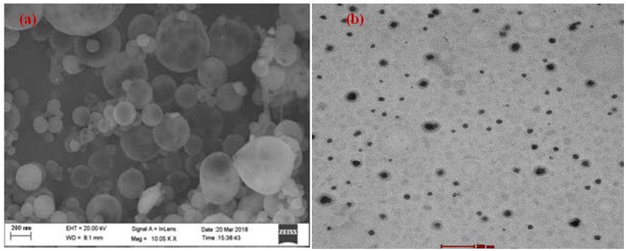 Fig. 1: SEM (a) and TEM (b) photomicrograph of optimized NLCs formulation at 1000KX