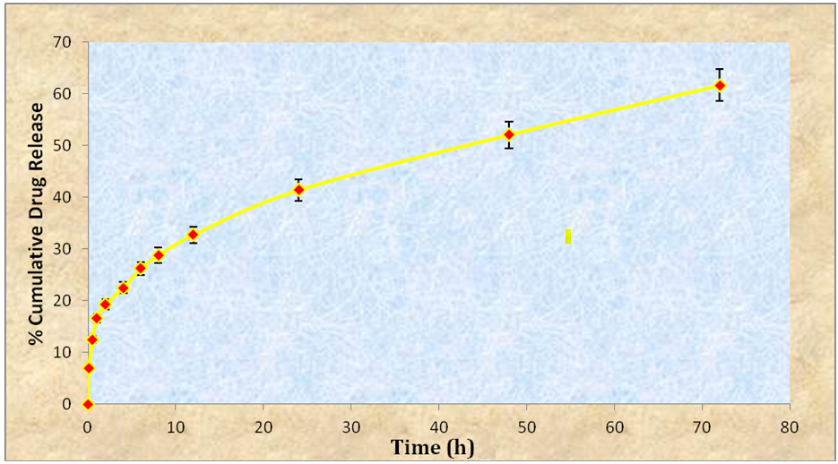 In vitro drug release from NLCs was carried out using Frenze diffusion cell method and found 61.6±3.2% in 72 hr. In the first 30 min, it was 12.45±0.9% drug release which slightly high. It was due to the release of free drug present in the bag after leaching from NLCs [27-29]. Drug release from NLCs formulation was found in a very sustained and controlled manner and follow Higuchi and Korsmeyer Peppas release kinetic. Drug release in 24 hr was 41.36±1.8 and 52.06±2.6 in 48 hr (fig. 2).