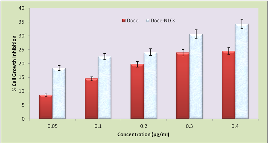 In vitro cell line study data shown that Docetaxel loaded NLCs was entered by the cancer cells and retard the growth by killing them in very low concentrations [6]. In vitro cytotoxicity using B16F10 was evaluated for plain docetaxel and docetaxel-loaded NLCs formulations in the concentration range of 0.05-0.5 µM of docetaxel. However, docetaxel and docetaxel-loaded NLCs showed 28.3±0.3 and 39.3±1.3 growth inhibition respectively after 48h upon incubation at 0.5 µg/ml concentration (fig. 7.2). This was due to the high penetration of docetaxel-loaded NLCs into cancer cells. The value of IC50 for docetaxel and docetaxel-loaded NLCs was found to be 0.2 µg/ml and 0.1µg/ml following 24 hr and 48 hr incubation, respectively which was more than 5-fold lower as compared to free docetaxel (fig. 3).