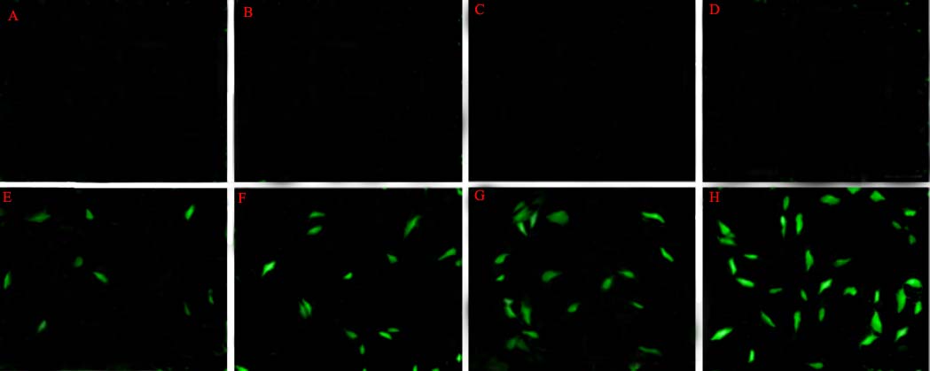 Fig. 4: Cell uptake (fluorescence microscopy) image of the plain drug (A-D) and Docetaxel loaded NLCs (E-H) after 4, 12, 24 and 28 h of incubation respectively
