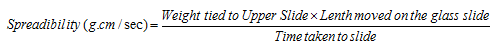 Spreadability of the formulation is necessary to provide sufficient dose available to absorb from the skin to get a good therapeutic response. It was determined by the method reported by Khan et al., (2013) [15]. An apparatus in which a slide fixed on a wooden block and the upper slide has movable and one end of movable slide tied with weight pan. To determine spreadability, placing 2-5 g of gel between two slides and gradually weight was increased by adding it on the weight pan and time required by the top plate to cover a distance of 10 cm upon adding 80g of weight was noted. Good spreadability show lesser time to spread [13, 15]