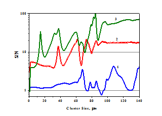 Fig. 1: Signal-to-noise ratio (SNR) when registering the size of water clusters by LALLS-method in water samples with the different content of heavy isotope of