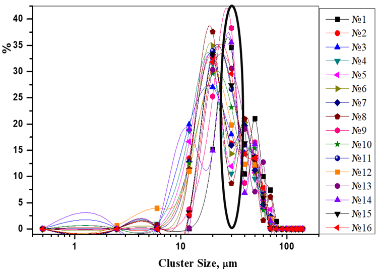 Fig. 2: The grain-size distributions by volume fractions ("size spectra") in laboratory samples of deuterium depleted water with different D/H ratios: № 1-10 ppm; № 2-20 ppm; № 3-30 ppm; № 4-40 ppm; № 5-45 ppm; № 6-50 ppm; № 7-55 ppm; № 8-60 ppm; № 9-70 ppm; № 10-80 ppm; № 11-90 ppm; № 12-100 ppm; № 13-110 ppm; № 14-120 ppm; № 15-130 ppm; № 16-140 ppm; n≥5, *P<0.05