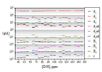 High-resistance waters with the [D/H] ratios of 45, 50, 55, 60, 70, 75, 80, 85, 90, 95, 100, 105, 115, 120, 125, 130, 140, 145, 150 (ppm) were investigated. For the titration of laboratory samples of deuterium depleted water in increments of 5 ppm the following reagents were used: Water, deuterium-depleted (≤1 ppm (D2O, Aldrich, USA); Deuterium oxide/Heavy water/Water-d2 (99.9 atom % D, Aldrich, USA; water Mili-Q (specific resistance 18.2 µS·sm at 25 оС, ТОС ≤ 5 ppb, Merck Millipore).